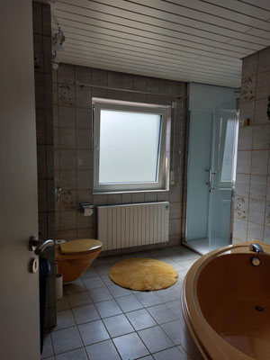 Im OG befinden sich aktuell zwei Doppelschlafzimmer, eins davon mit Balkonzugang und ruhiger Gartensicht und ein großes Badezimmer mit zwei Waschbecken, Dusche, Badewanne und WC.